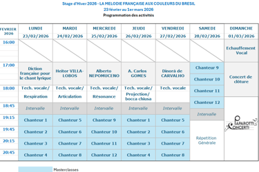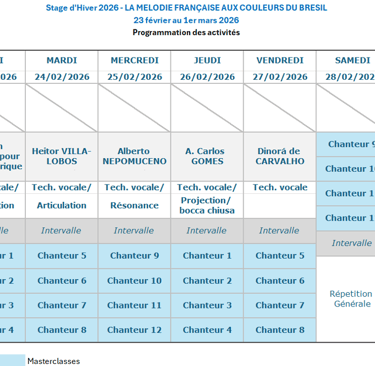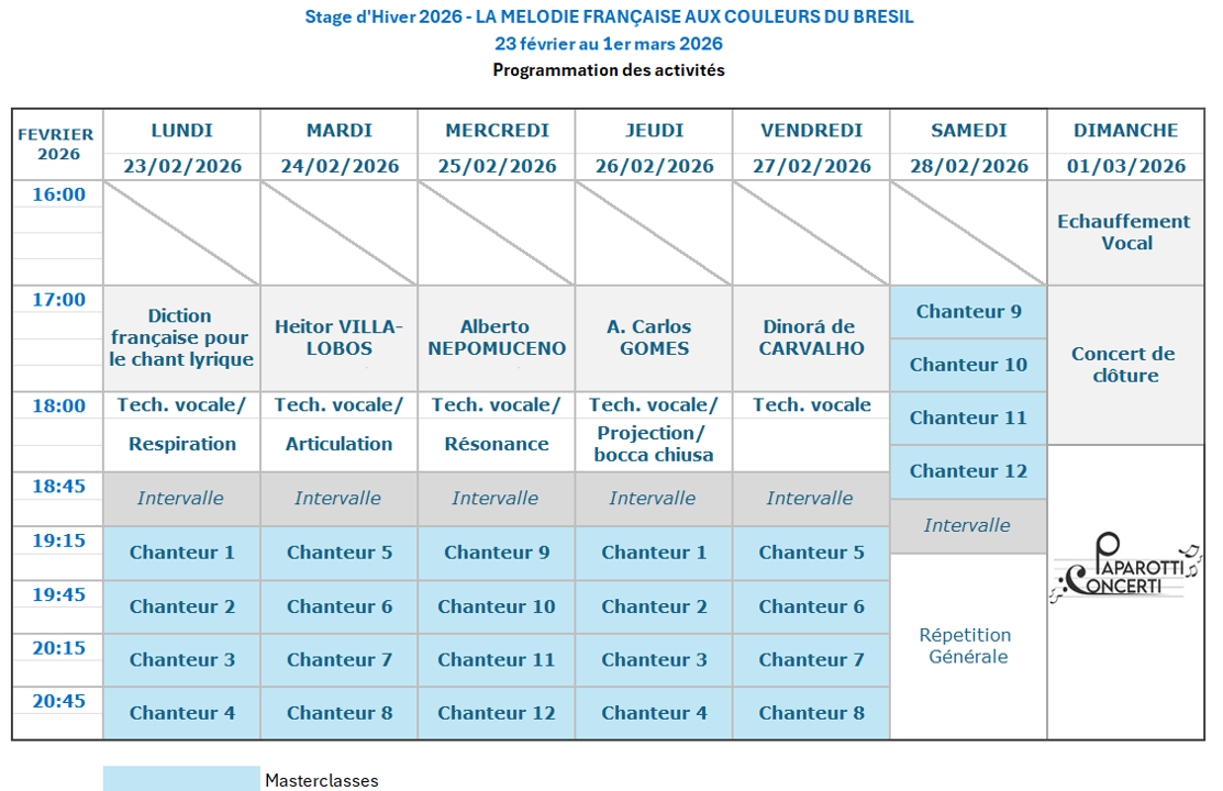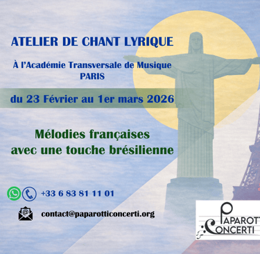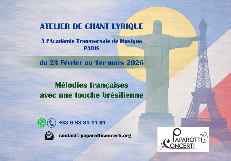 Destiné aux chanteurs désireux d'étendre leur répertoire et d'explorer de nouvelles couleurs musicales, le Stage d’Hiver 2026 PAPAROTTI CONCERTI met à l’honneur le dialogue fécond entre deux univers musicaux : la poésie française et la richesse des compositeurs brésiliens. Au cœur de cette édition, les participants exploreront un répertoire unique : des mélodies françaises inspirées de poèmes français, sublimées par l’écriture raffinée de grands maîtres du Brésil tels que Heitor Villa-Lobos, Carlos Gomes, Alberto Nepomuceno et Dinorá de Carvalho.